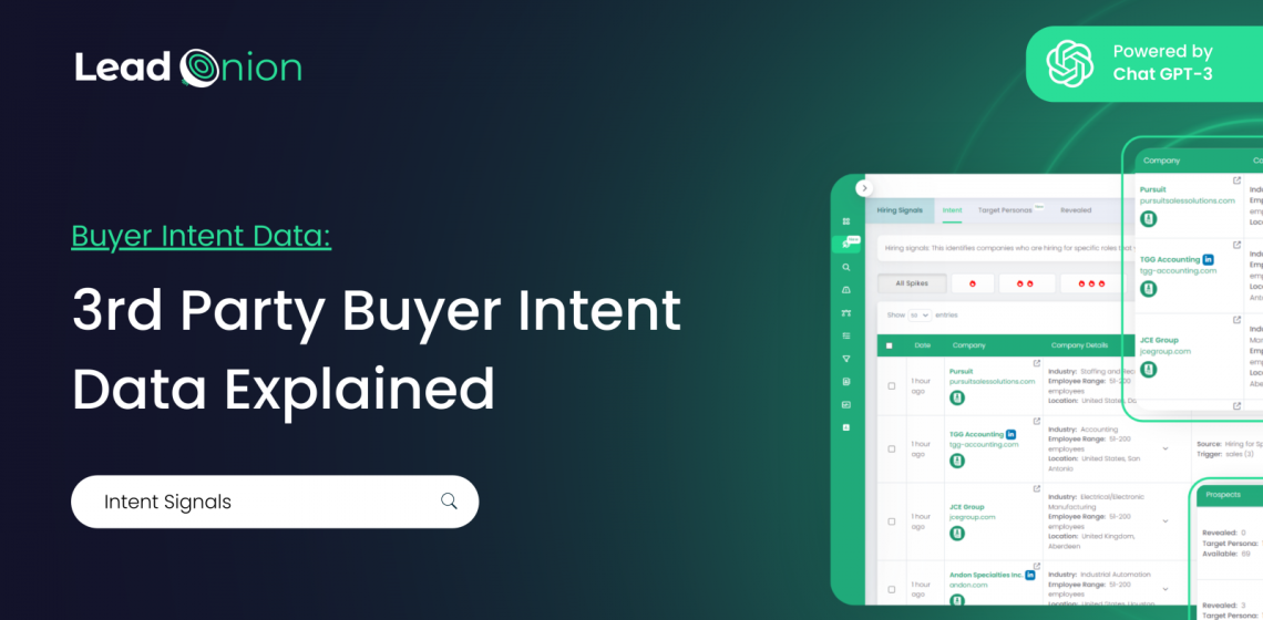 Lead Onion’s 3rd Party Buyer Intent Data tools are designed to help you find, prioritize, and engage with prospects showing genuine interest in your industry. From spotting emerging trends with Topic Intent to engaging high-potential leads with Hiring and Funding Signals, Lead Onion equips your team with the insights needed to make data-driven decisions and tailor your outreach for maximum impact.